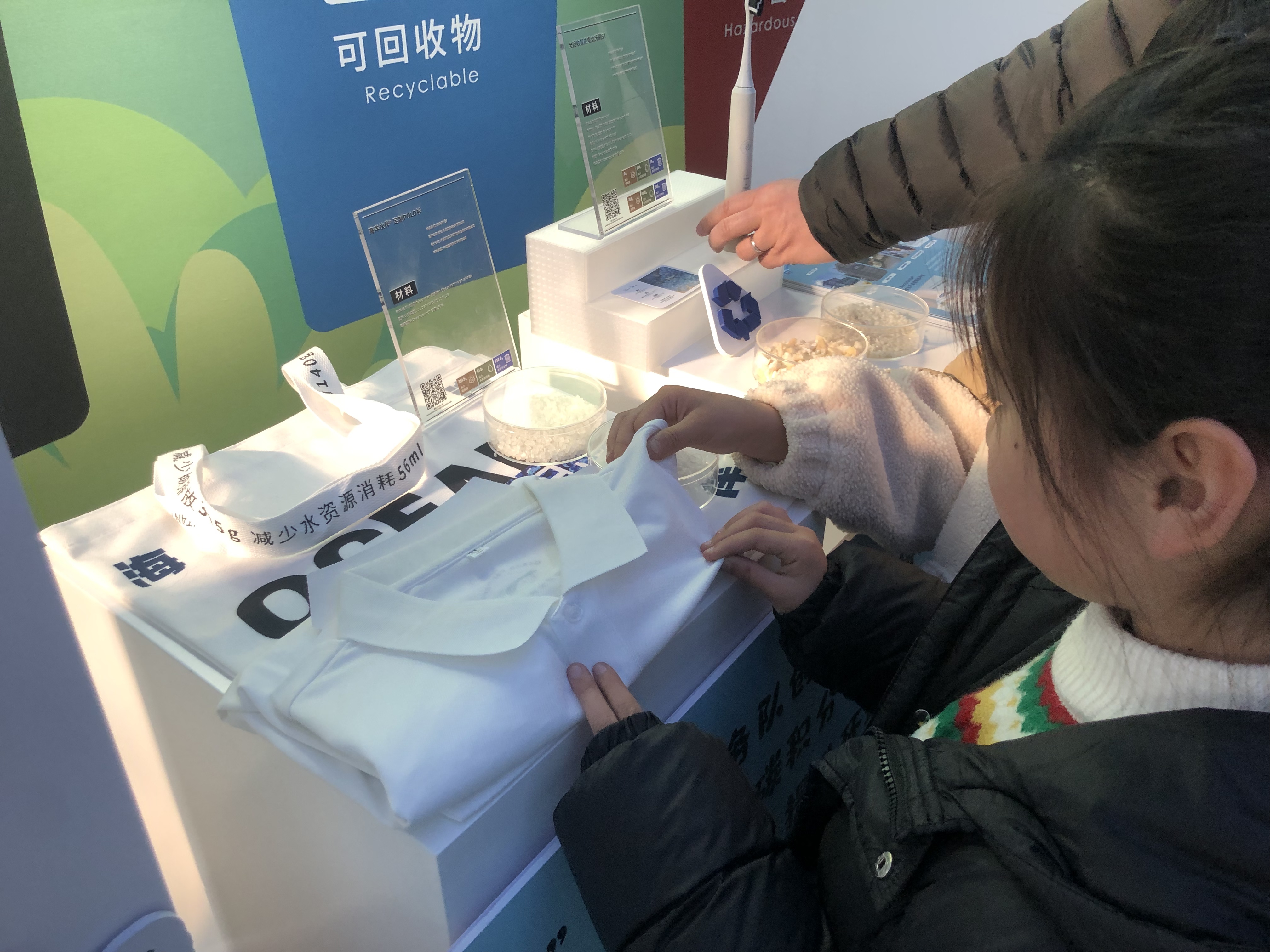活动现场,"海洋伙伴"志愿服务队带来的"海洋再生文创"引发热烈关注。渔网变身的棒球帽、塑料瓶再生的服装与包袋,以及用海洋浮球制作的全回收电动牙刷,传递着"变废为宝"的生态理念。"