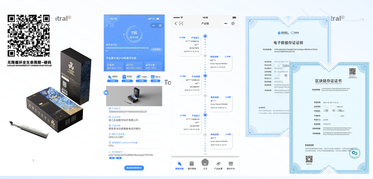 无论是文中提到的护目镜、电子产品外壳、旅行箱等文创与日用精品等,还是其他任何使用回收材料制成的产品,通过扫码都可以看到溯源。中间加工环节可加密,同时还可提供区块链证书。