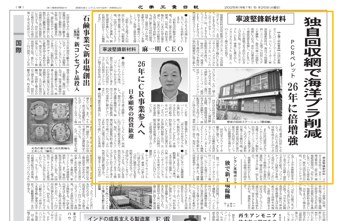 在2025CHINAPLAS上,宁波坚锋新材料有限公司的展台迎来了一位特殊客人——《日本化学工业日报》记者。这家日本最大化学行业专业媒体的记者对坚锋®公司创始人兼首席执行官麻一明进行了深度专访,详细了解中国企业在循环经济领域及海洋塑料污染治理的创新实践。近日,专题报道正式刊登在这家具有行业权威性的日本媒体上,不仅引发国内行化工行业的关注,也引发日本化工行业对中国海洋污染治理创新方案的广泛关注。