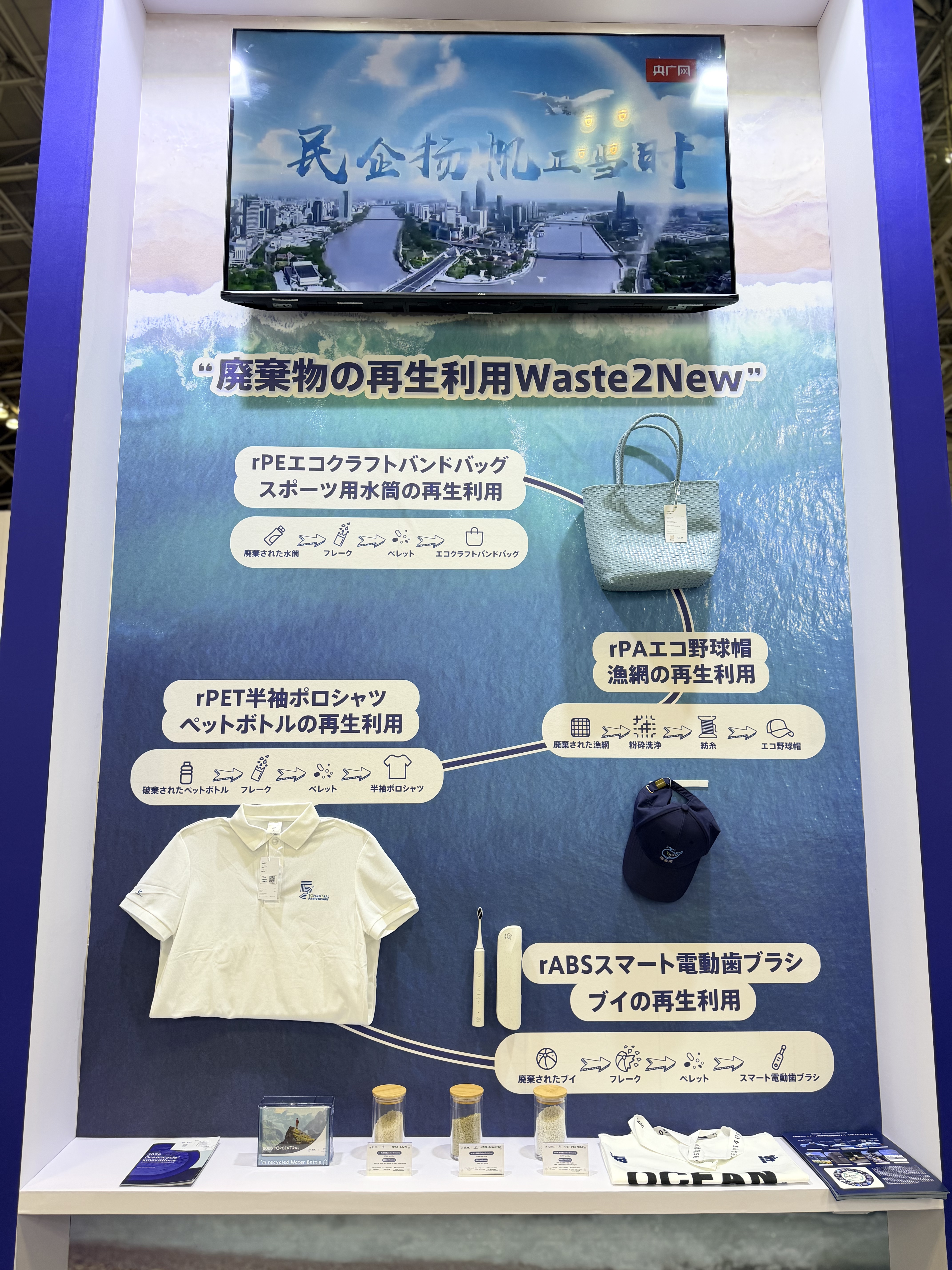 目前,坚锋®已经成功将海洋塑料再生料应用于多个高端领域。展台上,由海洋渔网再生的材料制成的棒球帽、汽车内饰部件,矿泉水瓶做成的服饰,浮球做成的电动牙刷等等,生动展示了"变废为宝"的商业化成果。"这种技术不仅解决了环境问题,更重要的是创造了经济价值。通过高值化利用,海洋塑料回收从单纯的环保投入转变为了具有商业回报的产业,这才是可持续发展的关键。