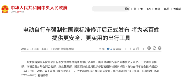 2025年12月1日,电动自行车强制性新国标(GB 17761—2024)全面落地实施,同时,旧版标准车辆全面禁止销售。此版新国标被称为“史上最严”,多维度提升了电动自行车安全门槛。